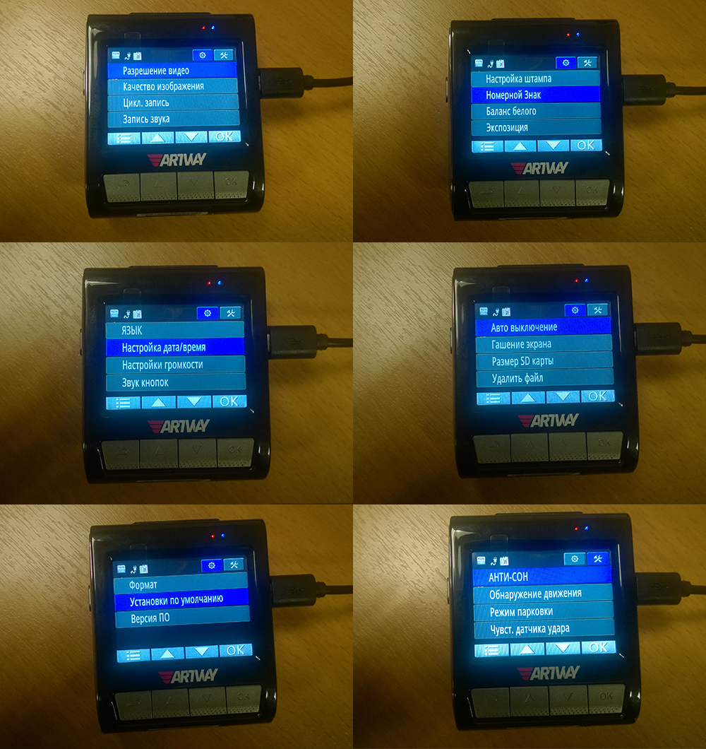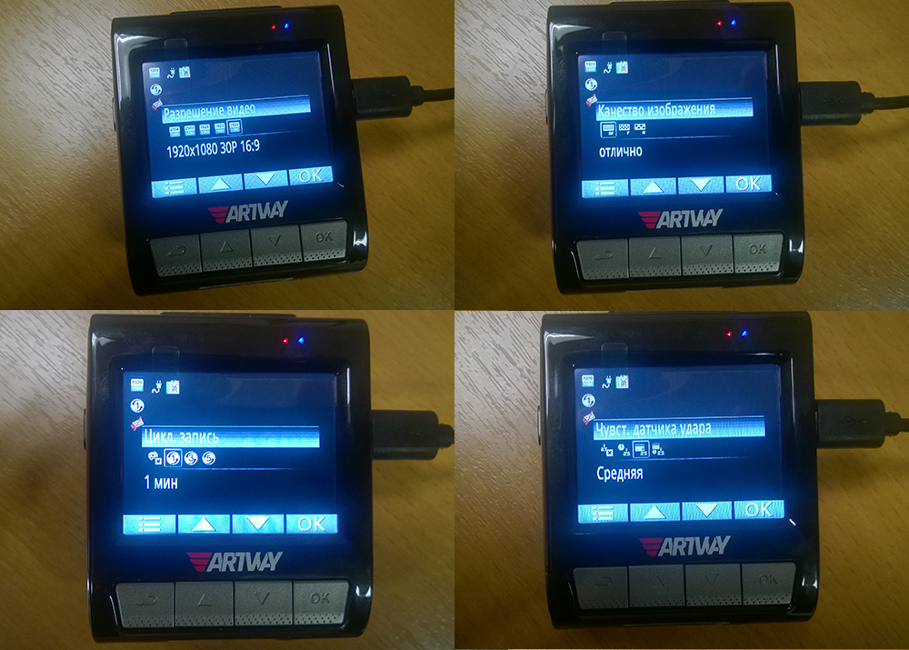 Можно настроить разрешение съемки, качество, так же можно выставить время одного ролика при циклической записи и выбрать режим чувствительности датчика удара, который позволяет защищать видеозаписи при аварийных ситуациях.