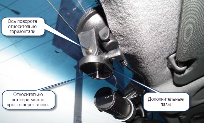 Само крепление подразумевает поворот только относительно горизонтальной оси. Но при необходимости регистратор можно повернуть относительно вертикальной оси, просто переставив на посадочном месте. При этом, в креплении предусмотрены 2 дополнительный паза для фиксации регистратора при повороте его на 90 градусов.