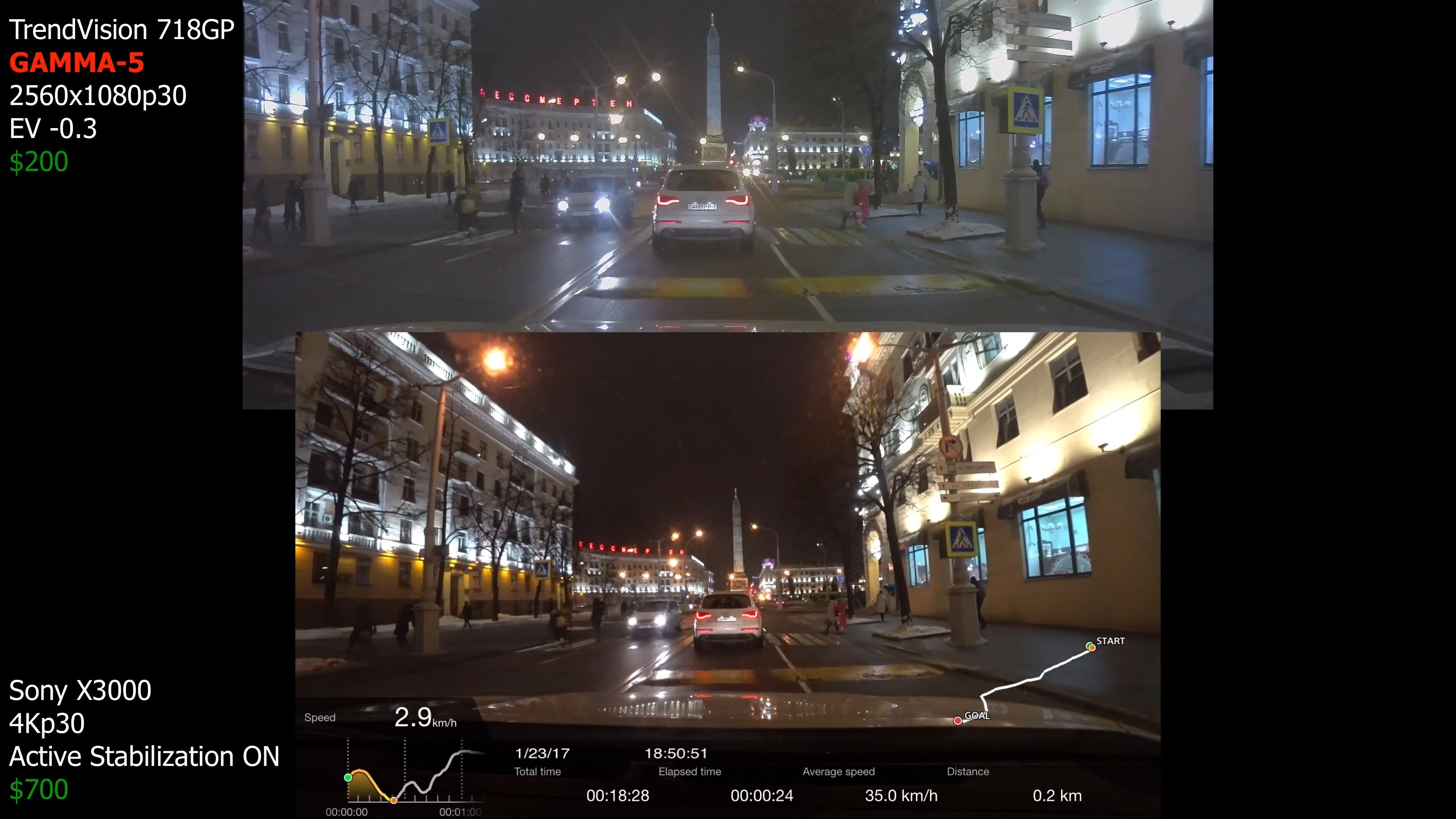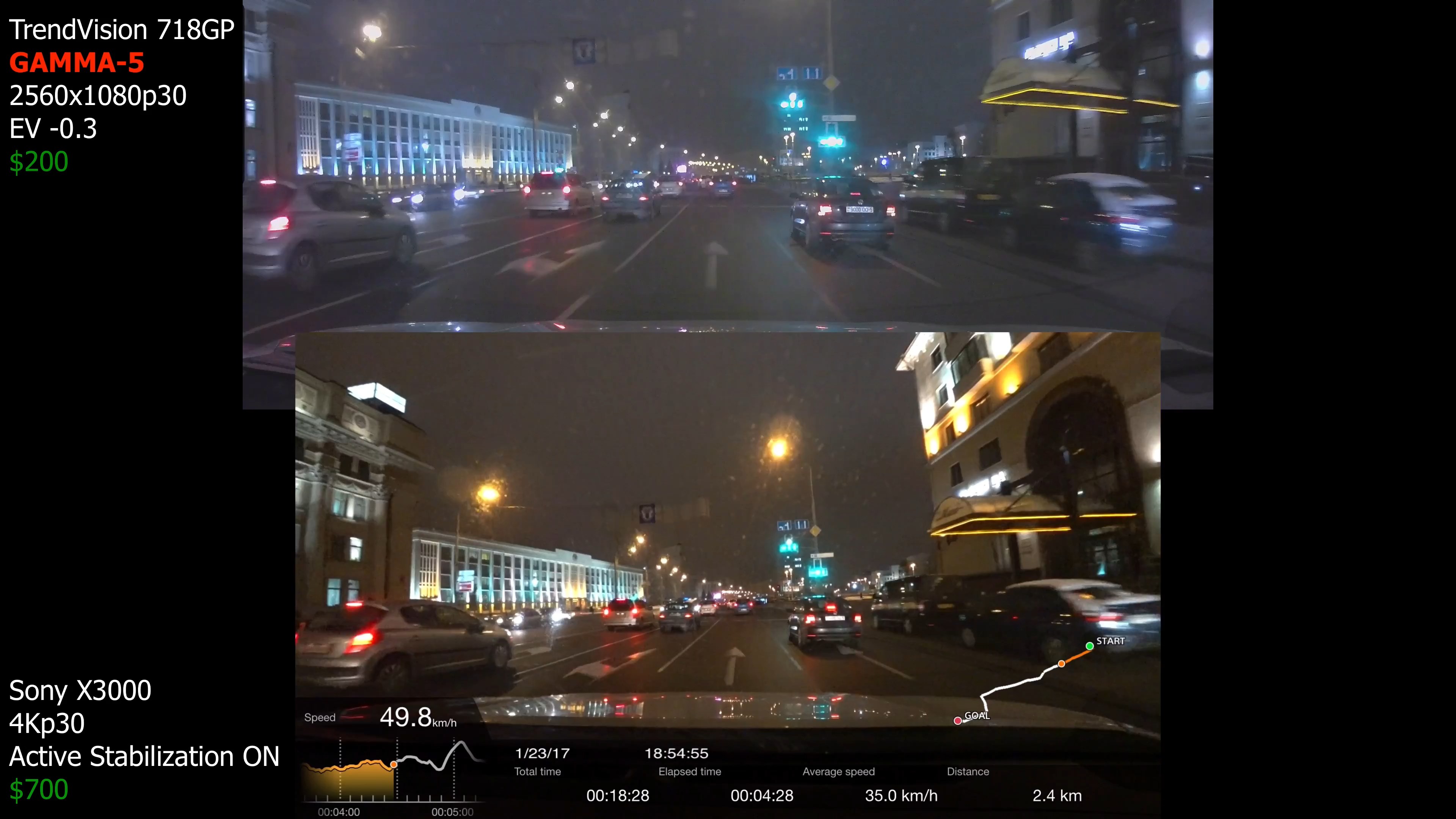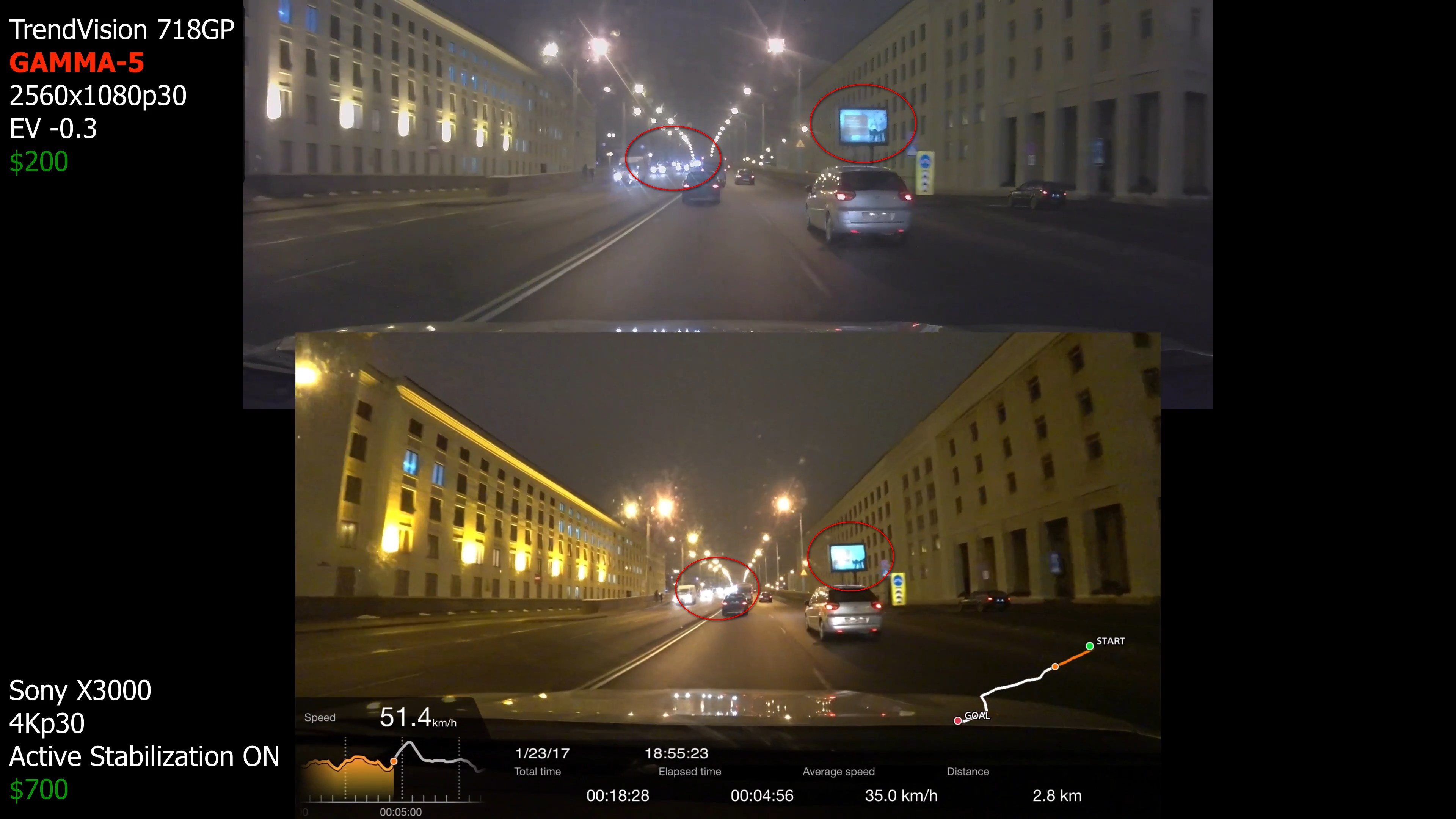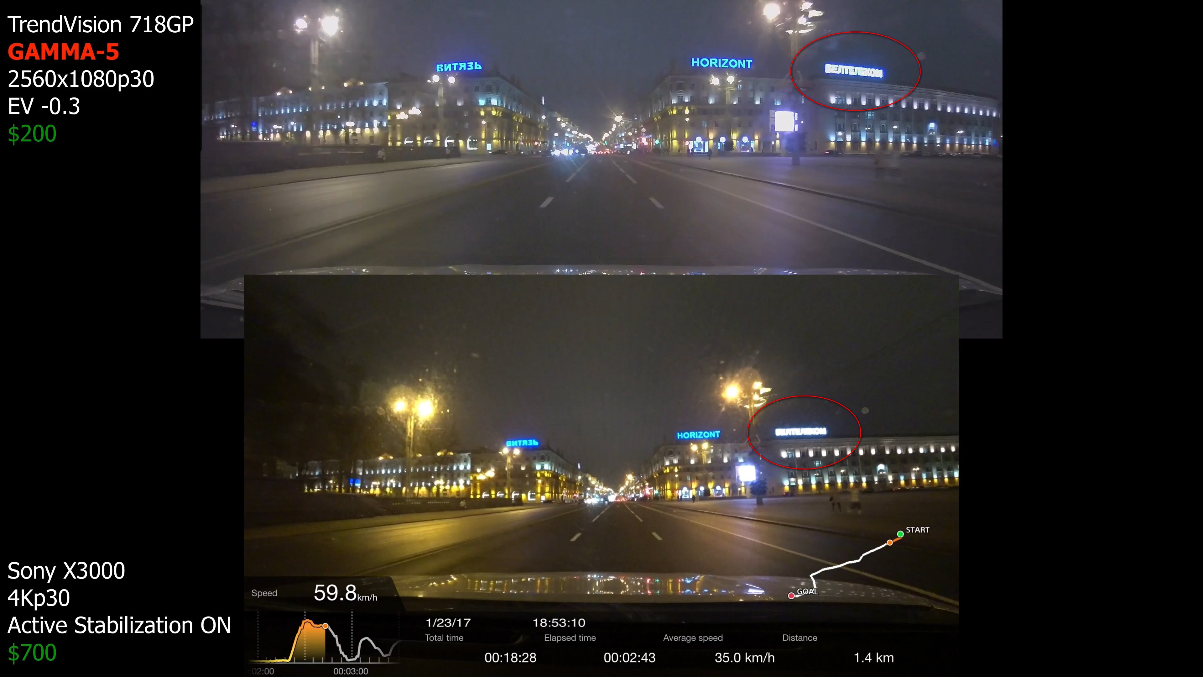 Понятно, что у 718 и Sony разные углы обзора и изменяли размер кадра чтоб объекты на видео были примерно одинакового размера. Но видео в окне меньшего размера всегда выглядит чётче и сочнее